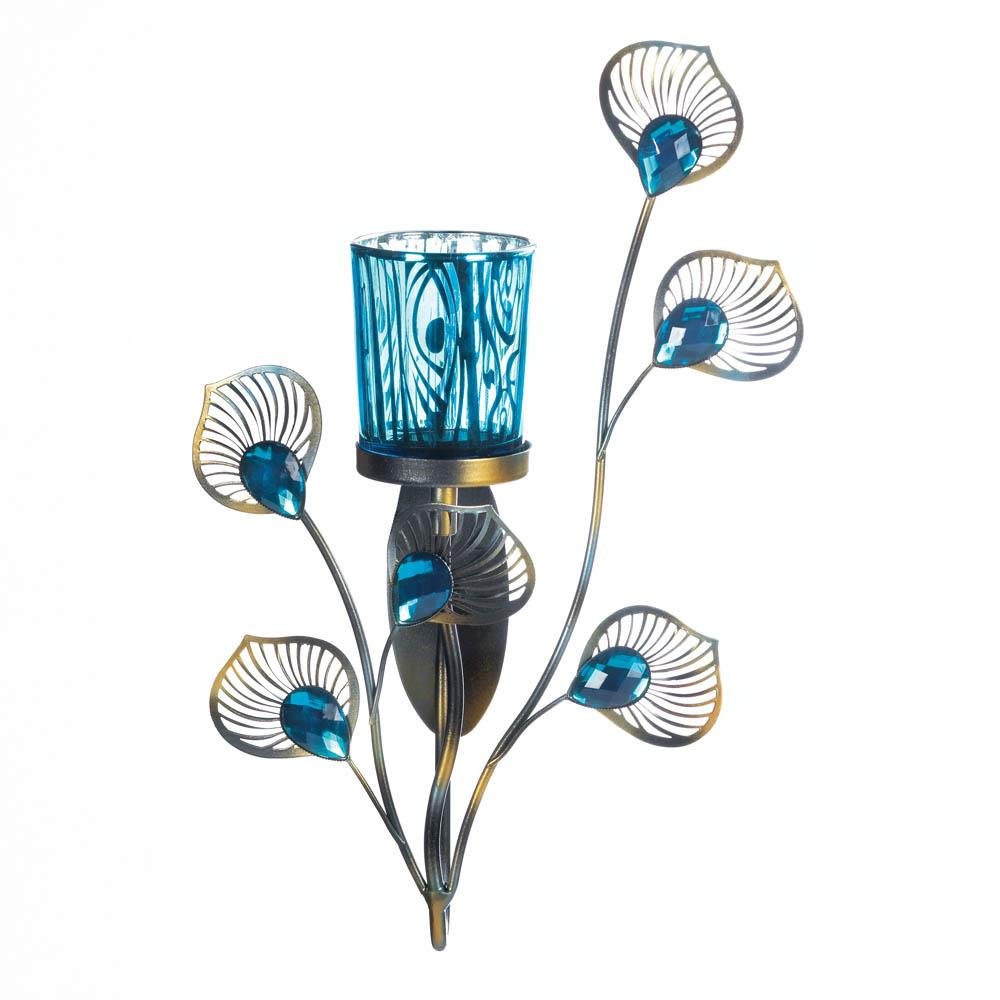 • This stunning peacock inspired wall sconce complete with metallic plumes and turquoise jewels will add colorful touch to any wall space.